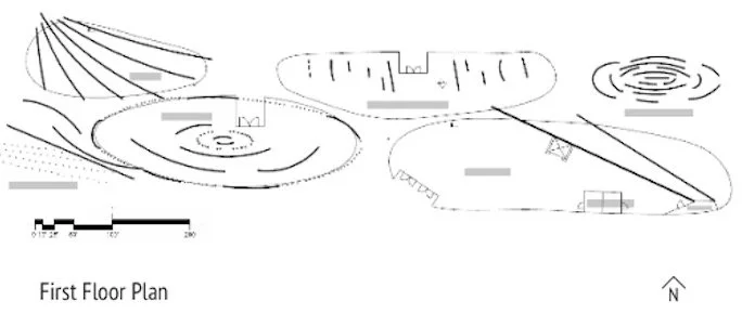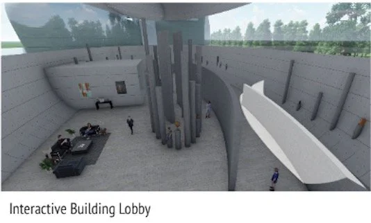 The first level and entry falls into a gift shop and corridor with an exhibit leading to stairs, risers, and an elevator. The second level holds a youth exhibit with experiential installations reflecting Dahlonega culture. Connected to that are balconies with optimal views of Lake Zwerner and the hills. Connected to that is the main gallery hall with many different exhibits flowing throughout the hall. A floor to ceiling curtain wall allows natural light to creep down the entire corridor illuminating the displays and hangings.