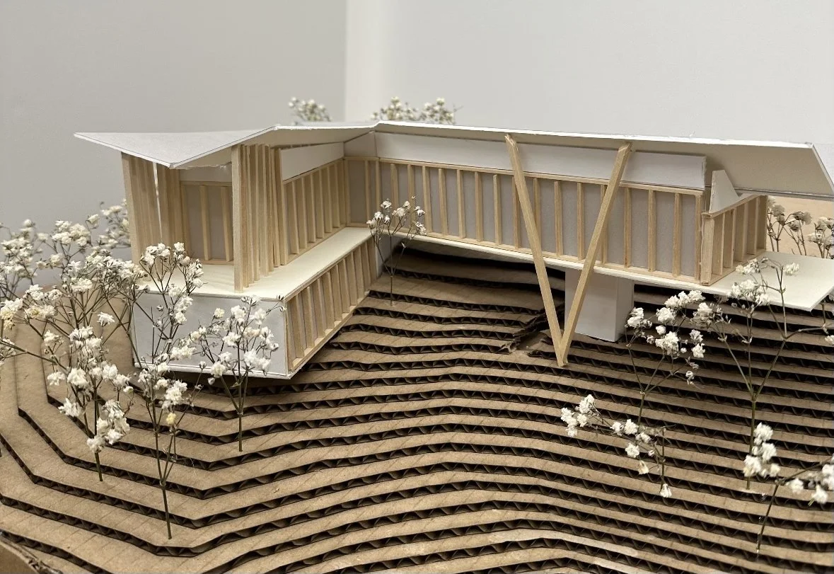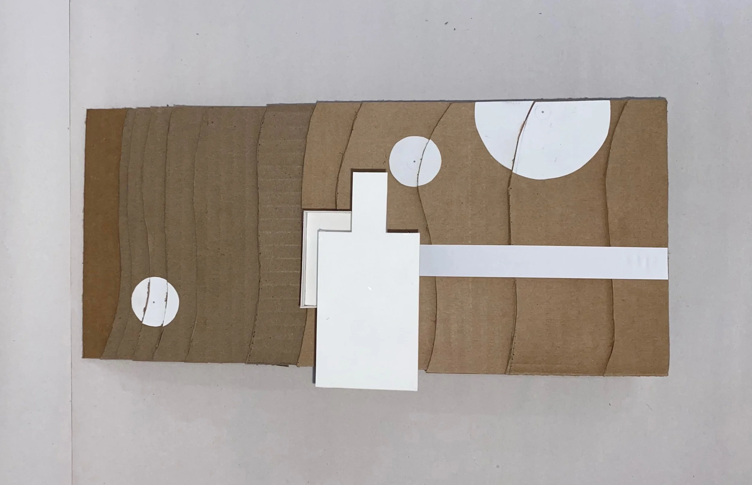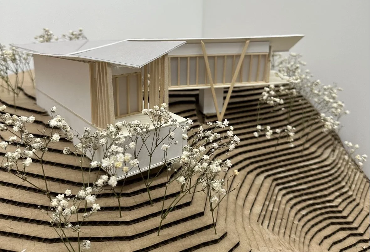 I made these floor plans with trace paper and micron pens. I made the model with bristol board and I made the site model with cardboard to represent the topography.