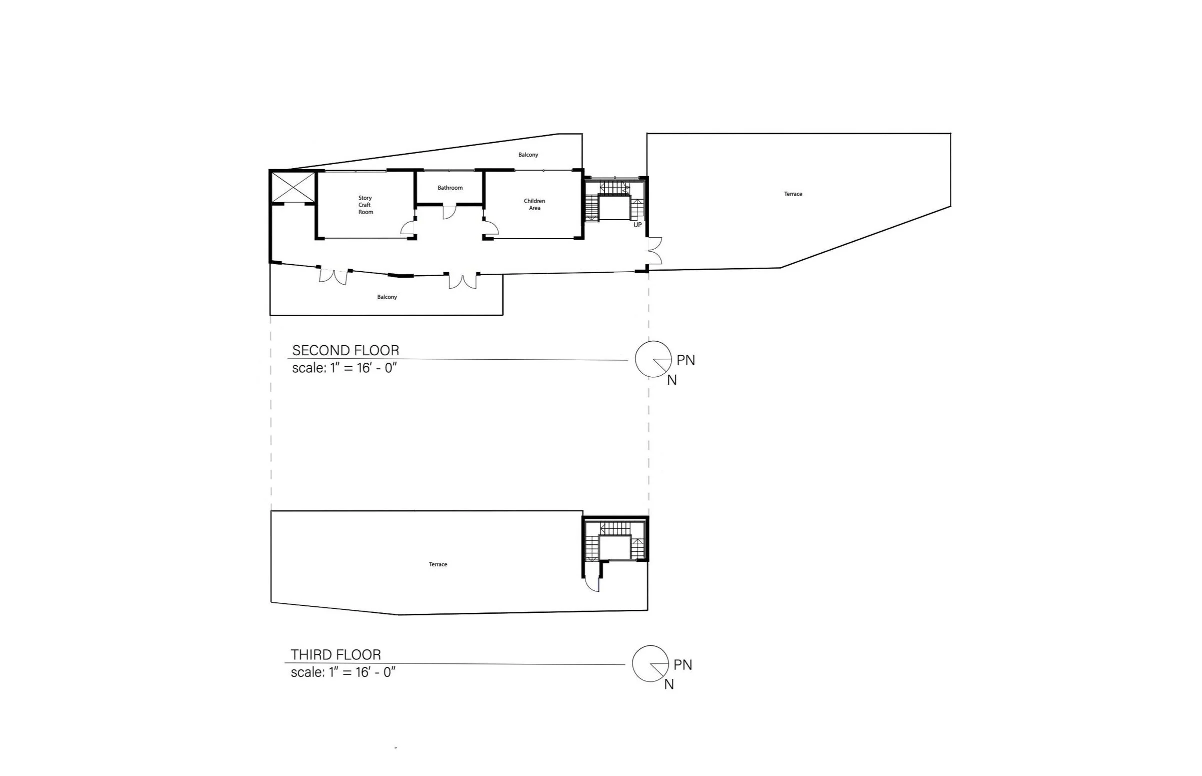 On the second level we were asked to include a writing space, bathroom, deck / outdoor space, and a book storage.