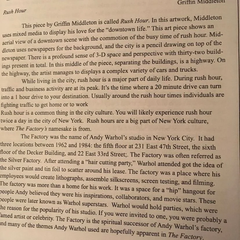 The High Museum made a label for my piece and intersected it to relate to Andy Warhol and his life as you can see in the photo below. Rush Hour was in display from June to September.